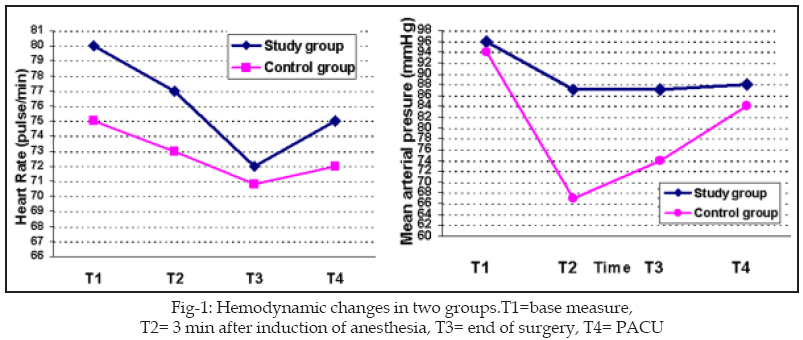 Mean of heart rate (HR) changes were not significantly different between two groups throughout anesthesia, but hypotension was higher in control group (p<0.0001; Fig-1).