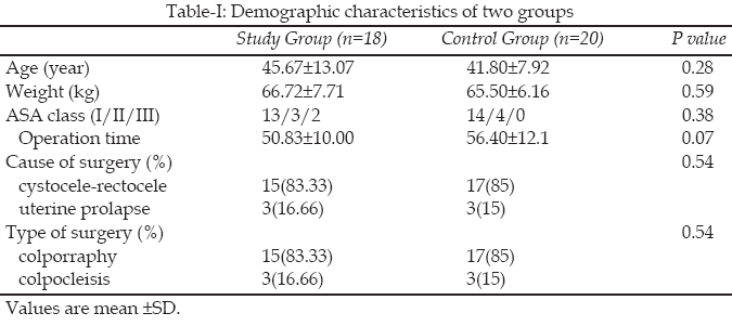 The mean age of patients was 42.18±11.10 years, with range 27 to 73 years. There was no statistical difference between two groups as regards age, weight, ASA class, type and duration of surgery (Table-I).