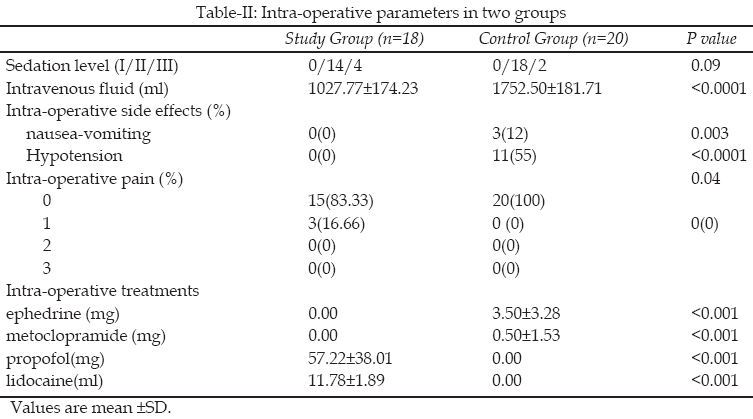 All patients in two groups were in the sedation level of II-III throughout procedure. None of study group experienced intra-operative nausea, but 3 (12%) patients of control group had nausea intra-operatively (p=0.003). Mean estimated blood loss was lower in the study group (39.17±13.20 ml vs 79.00±18.25ml; p<0.0001). Average intravenous fluid, ephedrine, and metoclopromide consumption was lower in study patients (p<0.0001 for each parameters).