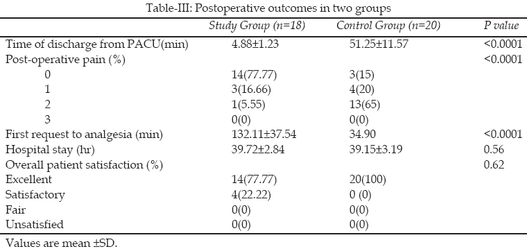 Postoperative outcomes are listed in Table-3. Most of study patients were admitted directly to the floor bypassing the PACU (mean length 4.88±1.23 min) but mean length of stay at PACU in the control group was 51.25±11.57 min (p<0.0001). Therefore, duration of anesthesia in the control group statistically was longer than the study patients (p<0.0001). Postoperative pain score was lower in study patients (p<0.0001) and the first request to analgesia was longer in the study group (132.11±37.54 v.s 34.90±5.54; p<0.0001). All patients in the two groups were discharged within 42 hours of surgery (p=0.56).