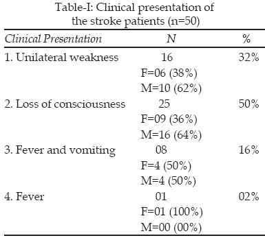 Results: Total 50 patients (30 males and 20 females) were studied. The average age at presentation was 59.5 years. The most common complains were unilateral weakness seen in 16 (32%) patients, loss of consciousness reported by 25 (50%) patients while fever with vomiting was observed in eight (16%) patients. Hypertension was the most frequent risk factor found in 28 (56%) patients whereas 18 (36%) patients were smokers as well as diabetic. Cerebral hemorrhage was seen in 18 (36%) patients, whereas ischemia was responsible for 31(62%) patients. Subarachnoid hemorrhage was found in one (2%) patient only. Eighteen (36%) patients were discharged alive while the remaining 32 (46%) patients died due to fatal nature of disease.
