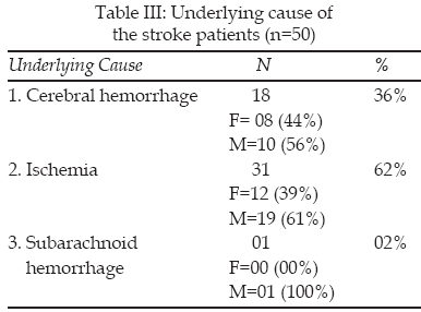 Conclusion: This study showed that the ischemia was the predominant cause of stroke in our patients. Mostly observed in older age group, hypertensive and smoker males. Morbidity and mortality was observed in those patients who reached hospital late. Further basic studies should be conducted for the prevention, early recognition and proper management of risk factors to reduce the incidence of disease and its fatal outcome.