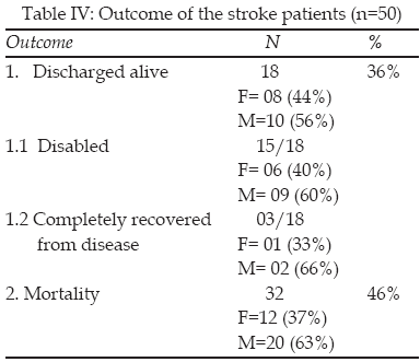 1-5, i-e 31 (62%), where as hemorrhage was found in remaining 18(36%) patients. All the patients were managed in the emergency department according to National and International management protocol.2 In our study none of the patients was managed with tissue plasminogen activator (tPA) due to unavailability of monitoring facilities for coagulation profile. All hypertensive patients were managed with anti-hypertensive drugs, studies shows that anti- hypertensive therapy results in a greater risk reduction.4 Eighteen (36%) patients were discharged home alive, out of them 15(83.3%) with physical disabilities such as pressure sores, urinary incontinence, speech loss.6,7 Four out of 15 disabled that is about (26.6%) patients developed post stroke seizures. When we compare it with other studies it showed 10% of survived patients develop post stroke seizure. Most common type of seizure was generalized seen in all 4 (26.6%) patients i-e is confirmed by an observational study.8-11 Majority of patients had ischemic stroke, but mortality was seen higher with haemorrhagic stroke.12 That was also confirmed by our study.CONCLUSION