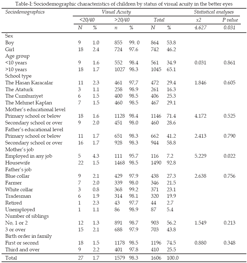 Table-I shows the socio-demographic characteristics of children by presentation of visual acuity in the better eyes. The frequency of presenting visual impairment for <20/40 was 1.7% in the better eyes. Nearly all the children (98.3%) had good visual acuity (>20/40).