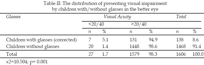 The proportion of children with glasses was only 8.6% (n=138). The frequency of a presenting visual impairment was significantly higher in children with glasses (corrected) as compared to children without glasses (5.1% versus 1.4%), (p<0.01). Twenty children without glasses examined needed glasses, glasses of 7 children with glasses needed to be corrected, and 131 children with glasses out of 138 were wearing the best correction. The distribution of a presenting visual impairment by children with/without glasses in the better eye is shown in Table-II.