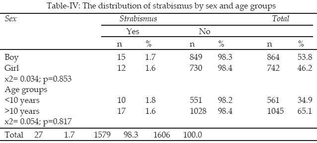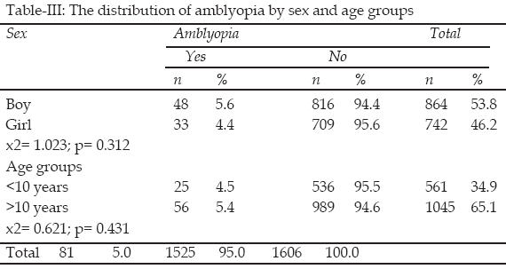 The frequency of amblyopia was 5.0% (n=81), and that of strabismus was 1.7% (n=27). Additional data are presented in Table-III & IV.