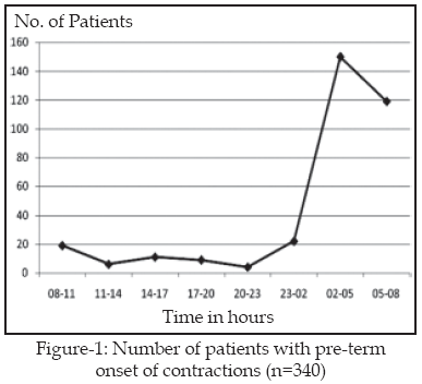 Two hundred twelve (33.5%) women were primi gravid and 157 (24.8%) women were multigravida [Table-I]. Precise timing of onset of uterine contractions was available in only 340 (38.33%) deliveries which shows peak in the early morning [Figure-1].