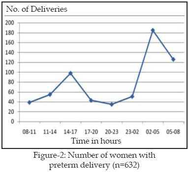 Results: During the study period, 632 preterm deliveries were recorded. Precise timing of onset of uterine contractions was available in 340 (38.33%) deliveries. Uterine contraction leading to labor started from 2:00AM to 5:00AM and 397 babies delivered during the night / early morning (8:00 PM to 8:00 AM) and 235 babies were delivered during day (8:00AM to 8:00PM) [chi2 = 7.908; p= 0.004]. Among all babies delivered during night / early morning 311 (49.2%) were born between 2:00AM to 8:00AM.