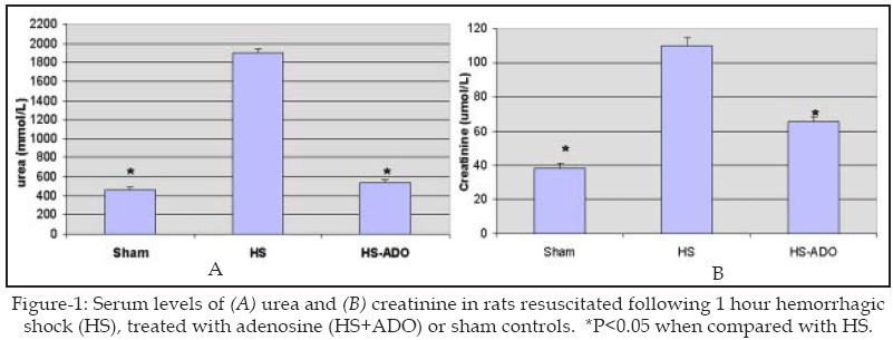 The protective effect of treatment with adenosine before resuscitation was evidenced by markedly lowering the serum levels of urea and creatinine in the hemorrhage treated group as compared to the hemorrhage untreated one(Figure-1).