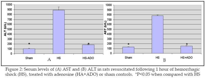 As compared to sham hemorrhage group, resuscitation from one hour of hemorrhagic shock resulted in significant rise in the serum levels of AST and ALT compared to sham group, demonstrating the development of he patocellular injury triggered by hemorrhage and resuscitation. Treatment with adenosine before resuscitation lowered the levels of AST and ALT in the hemorrhage treated group (Figure-2).