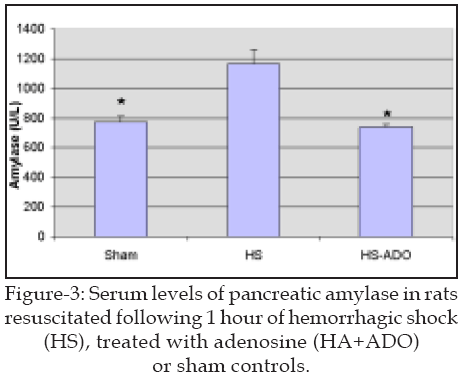Resuscitation following one hour of hemorrhagic shock did result in non-significant rises in the serum levels of amylase, demonstrating the possibility of pancreatic injury (Figure 3). Pretreatment of rats with adenosine non-significantly decreased the levels of amylase (Figure 3).