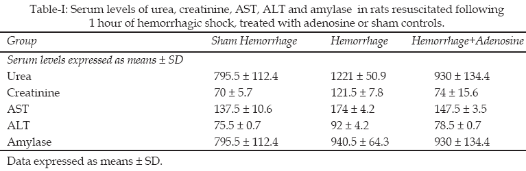 Methodology: The study was conducted at Cardiovascular Physiology laboratory, King Saud University, Riyadh in 2007-2008. Anesthetized male Sprague- Dawley rats were assigned to hemorrhage and resuscitation treated with 20mM adenosine , untreated, or similar time matched control groups (n=6 per group). Rats were hemorrhaged for one hour using a reservoir model. Arterial blood pressure was monitored for one hour, and maintained at a mean arterial blood pressure of 40 mmHg. Adenosine 20mM was injected intra-arterially, before resuscitation in the adenosine treated group. Resuscitation was performed by reinfusion of the sheded blood for 30 minutes. Arterial blood samples were analyzed for biochemical indicators of multiple organ injury: 1) liver function: aspartate aminotransferase (AST), alanine aminotransferase (ALT), 2) renal function: urea and creatinine, 3) pancreatic function: amylase.
