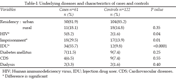 Sixty one cases with the mean age of 41.7 ±17.8 years, and 122 controls with the mean age of 40.7 ±15.8 years, were studied. Of total 61 case 42 (68.9%) were cigarette smoker. Of total 122 controls 22(18%) were cigarette smoker. The estimated odds ratio (OR) of the association between smoking and tuberculosis was 10.1 [(95% confidence interval (CI) 4.3 to 23.5), p<0.001]. The mean cigarette per day in cases and controls was 8.9 ± 7.7 and 7.3 ± 7.1, respectively (P=0.5). The mean of pocket –year of smoked cigarette (20/pocket) in cases and controls were 15.9 ± 13.7 and 13.5 ± 9.1, respectively (P=0.5).Residency status, co morbidity and other data among studied patients are shown in Table-I. There was significant differences in HIV infection, injection drug use (IDU) and imprisonment between two groups (P<0.05).