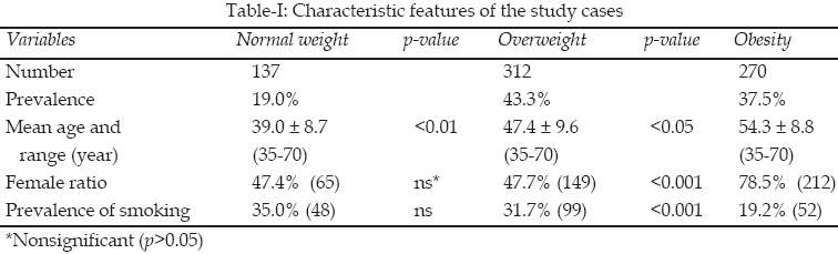The study included 721 cases (426 females). There were only two cases (two males) (0.27%) in the underweight group, thus this group was not taken for comparison. Prevalences of smokers were 35.0%, 31.7%, and 19.2% in the normal weight, overweight, and obesity groups, and the differences between the obesity and the other two groups were significant (p<0.001 for both). But the female predominance of the obesity group was probably the cause of the difference (Table-I).