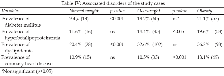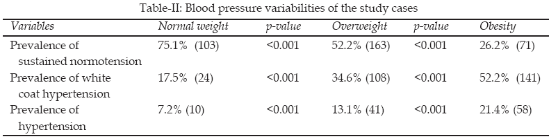 It was observed on ABP that the white coat effect was initiated by leaving home to come to hospital. Eleven of the 109 hypertensive cases (10.0%) actually had masked HT. Additionally, when we compared the three groups according to DM, hyperbetalipoproteinemia, dyslipidemia, and CHD, the gradual and significant increases from the normal weight towards the overweight and obesity groups were nearly seen in all steps (Table-IV).