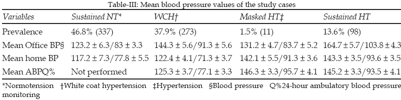 Eventually, the prevalences of WCH and HT were up to 52.2% (141 cases) and 21.4% (58 cases) in the obesity group, respectively. In other words, 73.7% of the obese cases had either WCH or HT. The 382 patients with WCH and HT were both diagnosed via HBP and ABP, and no difference was observed between the two methods according to the diagnosed numbers of cases with WCH or masked or obvious HT. Mean systolic/diastolic OBP, HBP, and ABP values are given in Table-III.
