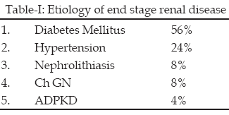 The total numbers of the patients in the study were 50. The mean duration on dialysis was 16+ 14.49 months. The main causes of ESRD were diabetes mellitus 28 (56%) and hypertension 14 (28%) Table-I.