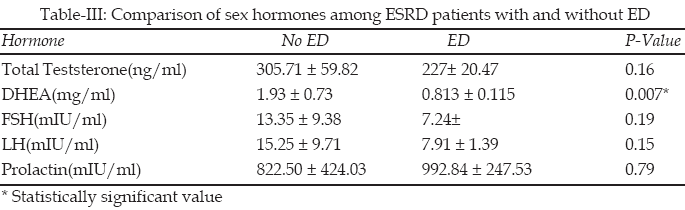 Conclusion: The majority of the patients suffering from ESRD, on maintenance HD had ED. DHEA was significantly lower in patients with ED, compared to those with no-ED. Total testosterone and DHEA had an inverse relationship with diabetes and age of the patients. Total testosterone, FSH, LH and prolactin did not affect erectile function.