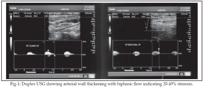st hour and C reactive protein was 12 mg/L. TPHA was non-reactive and CPK was 45 U/L. Serological study for ANA, c-ANCA and p-ANCA were all negative. Her serum bilirubin, alanine amino transferase, routine microscopic examination of urine, serum creatinine, albumin and lipids profile were normal. Mantoux test was positive and chest X-ray posterior/anterior view was normal.USG of whole abdomen showed normal study and echocardiography reported normal cardiac chambers with normal valvular morphologies. Duplex vascular Ultrasonogram (USG) revealed significant narrowing of both subclavian arteries with descending abdominal aorta (Fig-1).