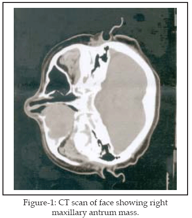 Baseline investigation including full blood count, urea and electrolytes, liver function tests and chest X-ray were normal. CT scan of paranasal sinuses (Figure-1) showed soft tissue mass completely filling the right maxillary antrum, measuring 4.7×2.7 cm extending into in right Ethmoidal sinus and right sphenoid sinus. Medially was extending into the nasal cavity, also eroding the nasal septum and laterally extending into infra-temporal fossa with no intra cranial extension. Differential diagnoses were a polyp, primary malignancy, least likely a metastatic deposit. The biopsy of the antral mass showed the cells with clear cytoplasm, and rich in blood vessels consistent with renal cell carcinoma (Figure2). Surprisingly, the bone scan was negative, and she was referred to radiation oncology department for palliative radiotherapy. Patient gave consent for publishing her case but refused publication of photographs.